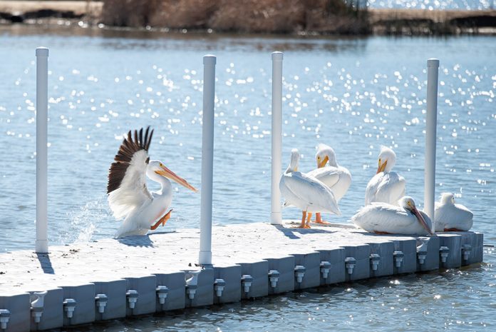 As they do several times a year, a flock of American White Pelicans made an appearance at the Lake Riverside Estates’ shallow lake.Often seen riding the thermals high above the small community, the group of white birds with yellow-orange beaks and feet and black wingtips splash land in the safe waters for a fish dinner.American White Pelicans commonly forage in the shallow waters of inland marshes, lakes and rivers. During migrations, they stop in these places to forage and rest. They do not normally winter inland, though the Salton Sea in Southern California is an exception.Flapping its wings for balance, this pelican perches on one of the bubblers in the water at Lake Riverside Estates. Anza Valley Outlook/Deli