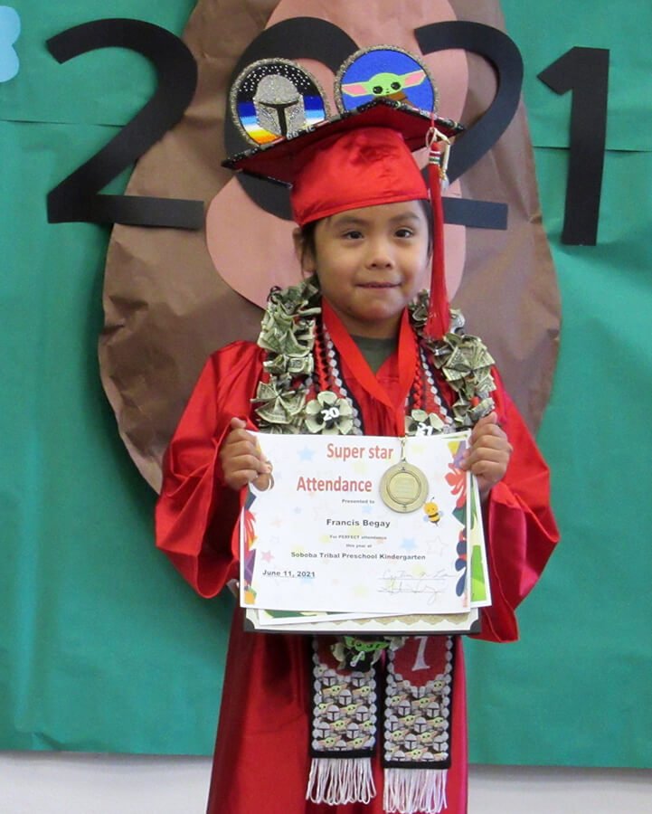 Kindergartners who are prepared to enter first grade are Francis Begay, Aiden Bentiste, Raylene Bigsby, Yawaywish Cardenas, Dean Cervantes, Maximus Guacheno, Betsy Lou Hunter, Jasper Lara, Romeo Ledezma, Dylan Medina, Annalissa Mendoza, Su’la Moreno-Vallanueva, Taw’val Morreo, Oóvish Ortiz, SuwoSwush Resvaloso, Suvoowut Rhodes, Aaliyah Rodriguez, Steeler Rodriguez, Náanat Silvas, Clementine Swan and Kalaeya Vega.