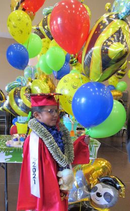 June 11 was set aside for an in-person, but socially distanced, promotion ceremony for 21 kindergarten students who completed all the necessary requirements to enter first grade in the upcoming school year. The multi-purpose room was decorated in a combination theme of rainforest sloths and bees. Kindergarten teacher Cindy Lee explained that at the beginning of the school year, due to COVID-19 restrictions allowing distance learning only, the students divided their time between Lee (sloths) and teacher’s aide Antonia Briones-Venegas (bees).