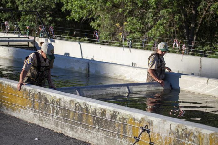 In this photo provided by the California Department of Fish and Wildlife, juvenile Chinook salmon are herded by CDFW staff in a raceway at the Iron Gate Fish Hatchery, in Siskiyou County, California, before their loading and relocation July 7. Baby salmon are dying in the thousands in one river and an entire run of endangered salmon could be wiped out in another due to excessive heat and extended drought in the U.S. West. Recently California fish and wildlife officials decided not to release more than 1 million hatchery-raised baby chinook salmon into the wild, and instead drove them to several hatcheries that could host them until Klamath River conditions improve. (Travis VanZant/CDFW via AP)