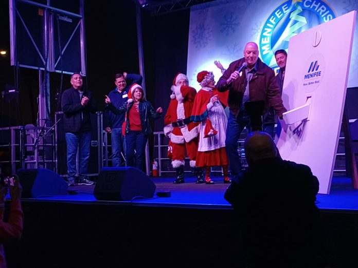 It was “snow” much fun for more than 1,000 Menifee families with excited children crowding the Mt. San Jacinto College Menifee Valley Campus during the annual Christmas tree lighting ceremony with imported snow, Santa and Mrs. Claus, NFL players and other dignitaries Dec. 4.The children, some who perhaps for the first time, felt the cold snow and slid down an imported ice chute and saw snow falling from snow-blowing elves and saw old St. Nick at the event that began just before dark. Delighting the parents and children was the traditional Christmas tree lighting enhanced by the falling snow and Christmas songs led by popular singer Anahi Rodriquez onstage.Children throughout the evening played giant Lego games, bucket pool, played in the snow, wrote to Santa while their parents