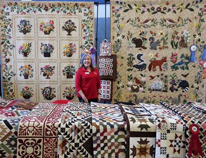 The Valley Quilters Guild presented its 42nd annual Quilt Show at Valley-Wide Recreation and Park District’s San Jacinto gymnasium Feb. 11 and 12. More than 100 displayed quilts showed a wide range of techniques, colors, themes and sizes.Thirty-three ribbons were awarded in a variety of categories such as pieced, miniatures, hand and machine appliquéd, innovative art, hand embroidered and more. Quilting awards included those that were computer assisted and edge-to-edge.Billie Kercmar said it is an honor to be chosen as this year’s Featured Quilter. She made her first quilt for her granddaughter’s 10th birthday about 20 years ago. She said she loves piecing and hand appliqué quilts and Civil War reproduction fabrics.A Hemet resident since 1957, Kercmar has entered her wo