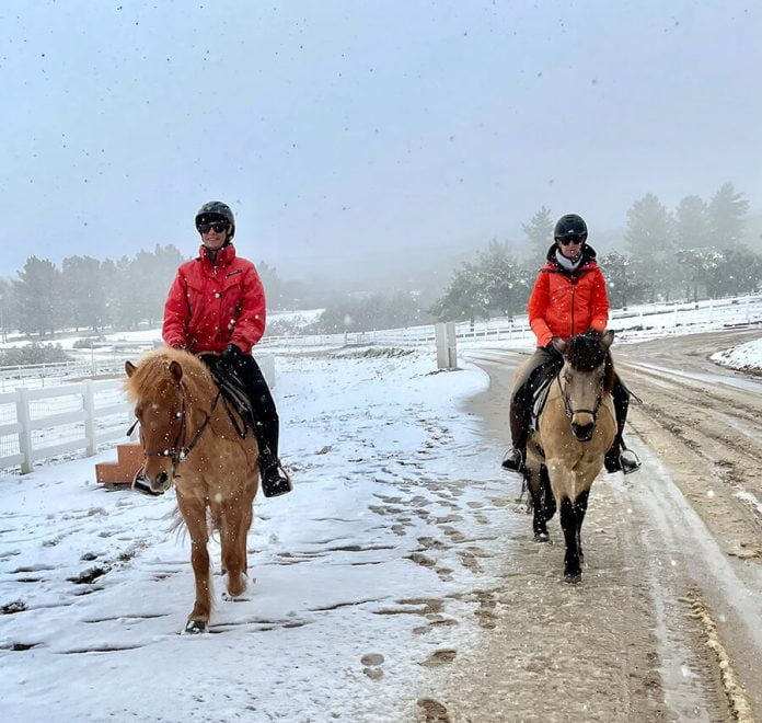 Sabrina Drake, astride Disa, left, and Jackie Burch on Assa, enjoy a snowy ride through Lake Riverside Estates Wednesday, Feb. 23. Anza Valley Outlook/Courtesy photo
