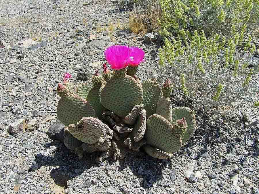 Delicate bright magenta or fuchsia-colored blossoms have been slowly opening in dry scrublands in the Anza Valley. The Beavertail cactus, Opuntia basilaris, is presenting vibrant flowers and contributing to the spring wildflower bloom.This oval-shaped cactus grows two- to three-feet tall and four-feet wide. It has short, greenish-purple segments resembling the tail of a beaver.These prickly pear cacti develop vivid rose, pink or reddish-lavender flowers on the upper edge of their pads from February through June. Fleshy round, pink, edible fruits develop after the flowers fade.These plants are common in the Southwest and Mexico, growing at elevations of 2,000 to 3,000 feet. They prefer rocky or sandy plains, valleys, washes and canyons in deserts where they flourish in sandy or