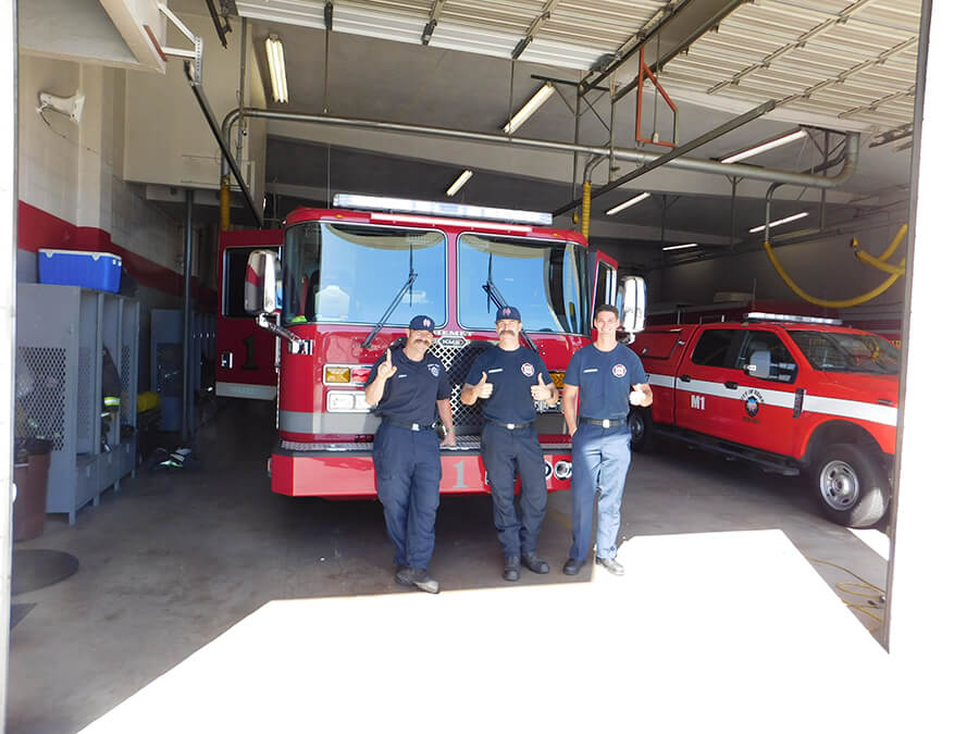 Even before Hemet firefighters traditionally pushed their new 500-horsepower KME fire engine into its new home at Station 1 in Hemet, it was called into service earlier this month.The shiny new engine with a 500-gallon water tank, hoses, paramedic equipment, Jaws of Life and the latest radio equipment is crewed by a fire captain, paramedic and engineer, all firefighters, for three shifts a day, is one of the busiest in the city. It can respond to fires, medical emergencies, accidents and other life-saving and fire protection calls.Day shift Capt. Eric Janert with engineer paramedic Greg Wilson and firefighter Robert showed off their new truck, making sure the batteries were charged and ready to go at any moment. All three firefighters said they were pleased with the new truck. The