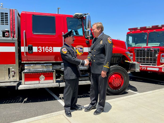 Menifee firefighter II Chad Burns receives congratulations from Bill Weiser, fire chief for Cal Fire Riverside County after receiving the governor’s Gold Medal of Valor for his heroic efforts to save a victim who had fallen into a storm water pipe runoff system. The award is the highest honor a state employee can receive. Valley News/Cal Fire photo