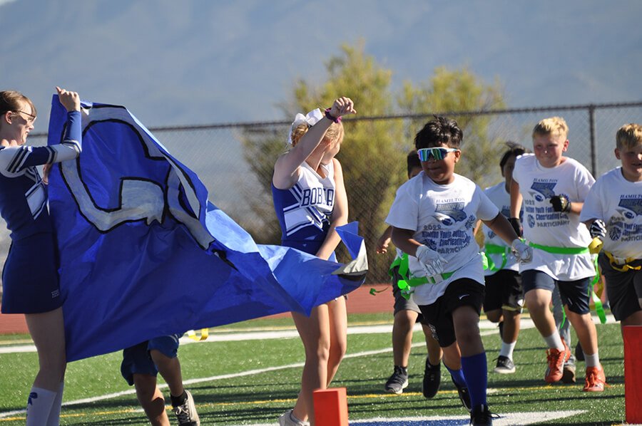 The Hamilton Youth Football & Cheerleading Camp students capped off a week of practice at their first exhibition flag football game Friday, Sept. 30, at the Hamilton High School football stadium.The action-packed game was exciting for the young players, who did exceptionally well, encouraged by the cheerleading squad’s chants and routines. Hamilton High School Head Football Coach Patrick McGowan and a slew of team members coached and guided the players in an abbreviated game of four 10-minute quarters. The enthusiastic flag football teams ended the competition 12-6.The special Youth Camp program enabled elementary and middle school athletes to participate in a competitive flag football game. During the prior week the youngsters were able to work directly with the football pla