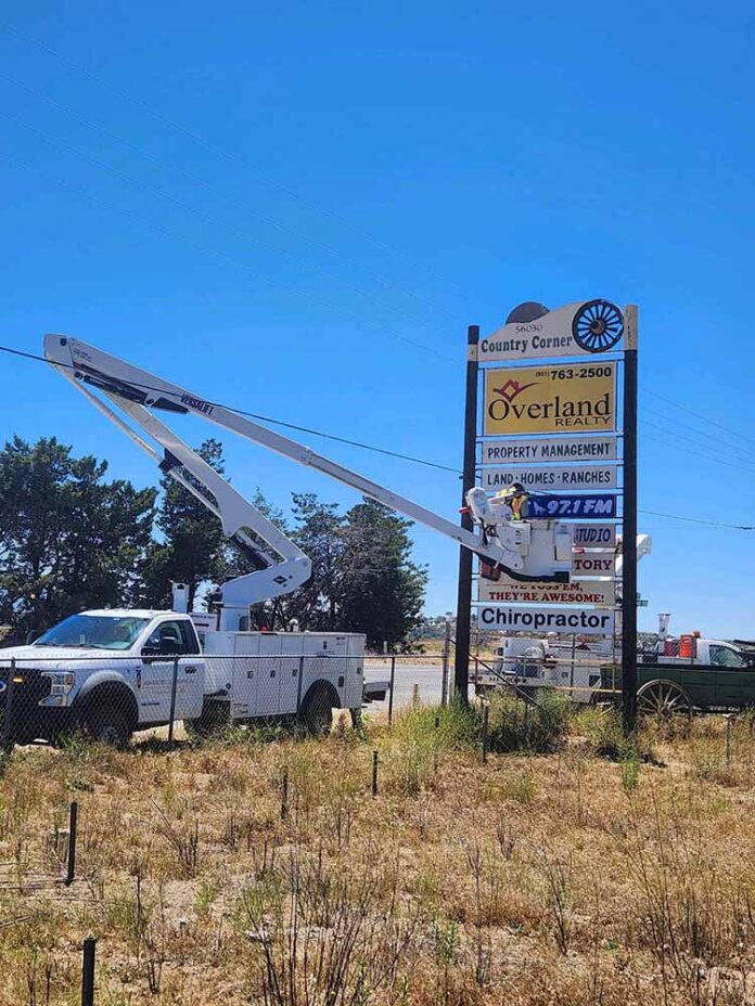 Anza Community Broadcasting KOYT 97.1 LPFM radio welcomed a new roadside sign with a little help from the Anza Electric Cooperative, Inc. The sign, designed and created by local signmaker Debbi Vesey, sported the KOYT lettering in white against a rich, blue background. The sign can be easily seen and read from the road.AEC crews arrived on scene Friday, July 7, to expertly install the sign, using a bucket truck to reach the lofty location.“Thank you Anza Electric Co-op for the rapid reply for the installation, and to Debbi Vesey for the excellent la