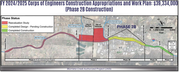 TEMECULA – Temecula Mayor James “Stew” Stewart announces, “Temecula businesses and residents located along Murrieta Creek will soon have critical flood protection.” Properties near Murrieta Creek will become the beneficiaries of the much-needed Murrieta Creek Flood Control Project (Phase 2B). The Federal Government allocated $39,334,000 toward the construction of Phase 2B of the Murrieta Creek, which can now proceed due to the Fiscal Year 2024 House Energy and Water Development Appropriations Bill that was approved by the House and Senate last week and signed into law on Saturday, March 16.“The Murrieta Creek Flood Control Project has been making progress in phases since the tragic flood of January 1993 that put parts of Old Town Temecula under water,” states Temecula May