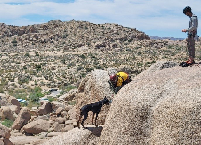 THOUSAND PALMS – A man and his dog reunited recently at the Coachella Valley Animal Campus after a recent rescue in Joshua Tree National Park. The rescue also illustrates the need for pet owners to use extreme caution when visiting wilderness areas.Christian Corona of Chino Hills was camping Sunday, June 9, at the Jumbo Rocks campground when his 10-month-old Doberman, Onyx, seemingly got spooked and ran away. Many attempts to find the dog all day Saturday and early Sunday were unsuccessful.“I never thought I would see him again,” Corona, 28, said.Later Sunday, Joshua Tree National Park officials started getting reports of a dog sighting. Onyx had climbed to a perch on rock formations, approximately 200 feet up, near the campground. JOSAR – a search and rescue outfit tha
