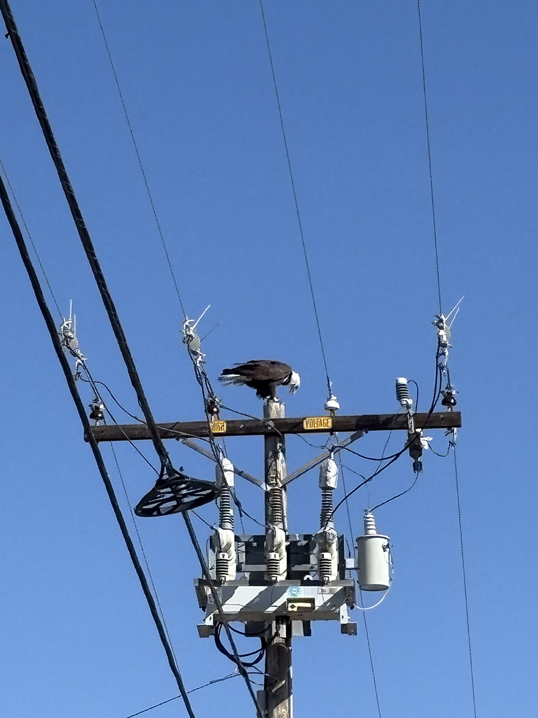 The bald eagle, America’s national bird, is a symbol of strength, bravery and resilience. Its image appears on currency, coins and stamps, and among the local Cahuilla People, it is known as Aswet.Anza resident Kathy Blair and her friend Ariel Hackney had the rare opportunity to observe and photograph one of these majestic birds Thursday, Jan. 30, at about 2 p.m.Blair, known for her heartfelt renditions of the National Anthem at parades, sporting events and patriotic gatherings, was in awe of the sight.“Coming back from the post office, we saw a bird land on a utility pole,” she said. “When we noticed it was an eagle, we immediately took video and pictures until a truck honked its horn.”Disturbed, the bi
