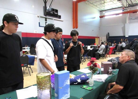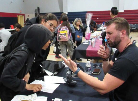 The entire student body attended at the same time, divided into two sessions with a short break in between. They were free to visit any table of interest to them, and there was plenty of movement among the 60-plus tables set up throughout the Soboba Sports Complex gymnasium. A few representatives, such as the Soboba Fire Department, Riverside County Sheriff’s Department, and a few branches of the military, were stationed outside the building.