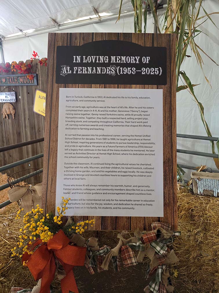 Longtime friends and former students went all out paying tribute to Al Fernandes at this year’s Southern California Fair, Oct. 9-12 in Perris. Fernandes, who dedicated his life to his family, education, agriculture, and community service, passed away in May.