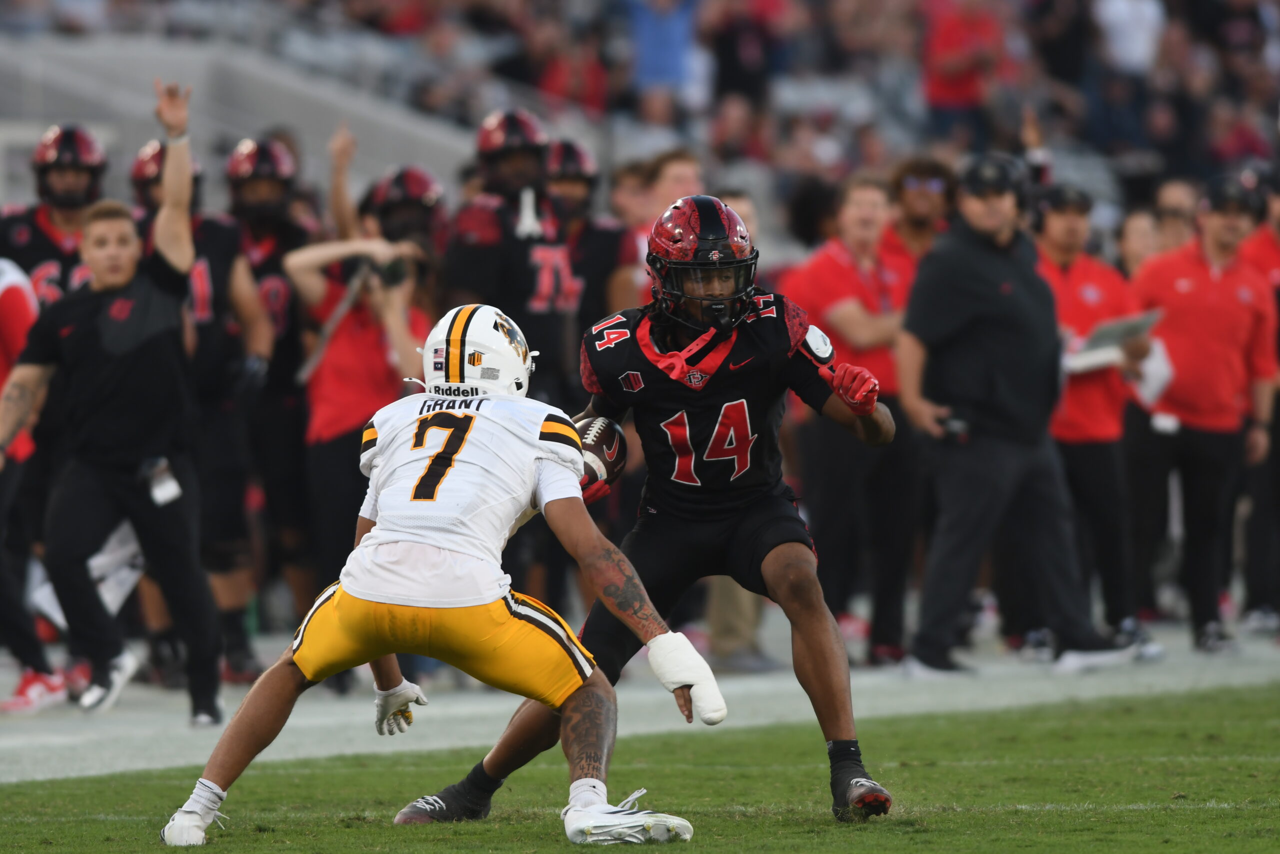 Donovan Brown (14) sprints downfield after a reception, adding to SDSU’s offensive momentum in the first half against Wyoming. Valley News/Action Captures Media Group