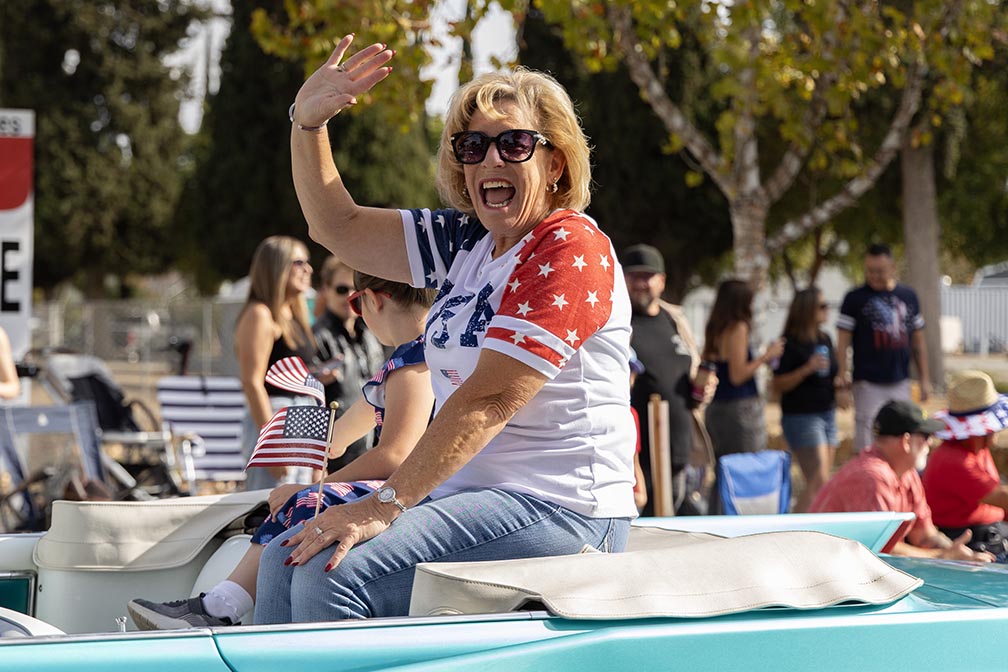 People wave American flags as members of the Drifters Classic Car Club drive their cars down Washington Ave during the Murrieta Veterans Day Parade, Tuesday, Nov. 11, 2025. Valley News/Andrew Foulk photo