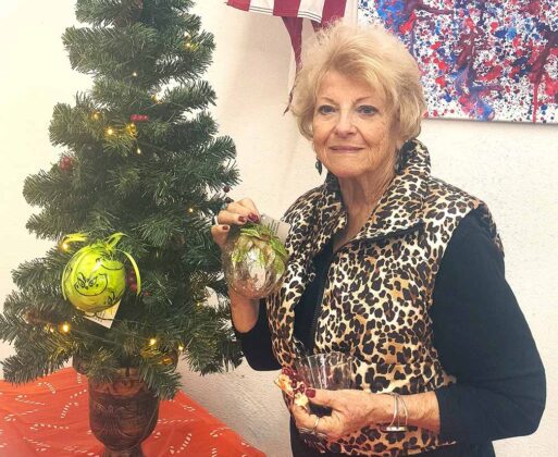 Artist Darlene Woodcock hangs an ornament on the Hemet Valley Art Association’s contribution to the 16th annual Jingle-Mingle. Valley News/Sheryl L. Cooley courtesy photo