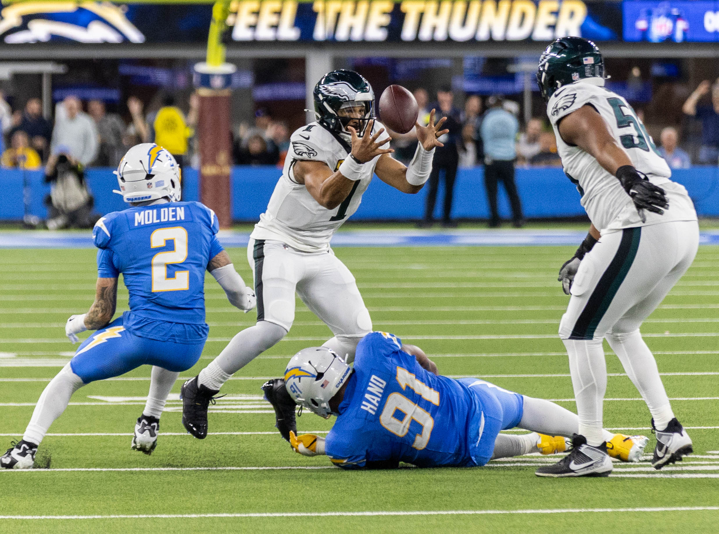 The defining moment arrived in overtime when safety Tony Jefferson intercepted a pass from Philadelphia quarterback Jalen Hurts. The turnover set up the game-winning sequence, marking the culmination of a dominant defensive performance that forced five turnovers throughout the night. It was the most turnovers Hurts has surrendered in his professional career, underscoring the suffocating pressure applied by the Los Angeles defensive unit.
