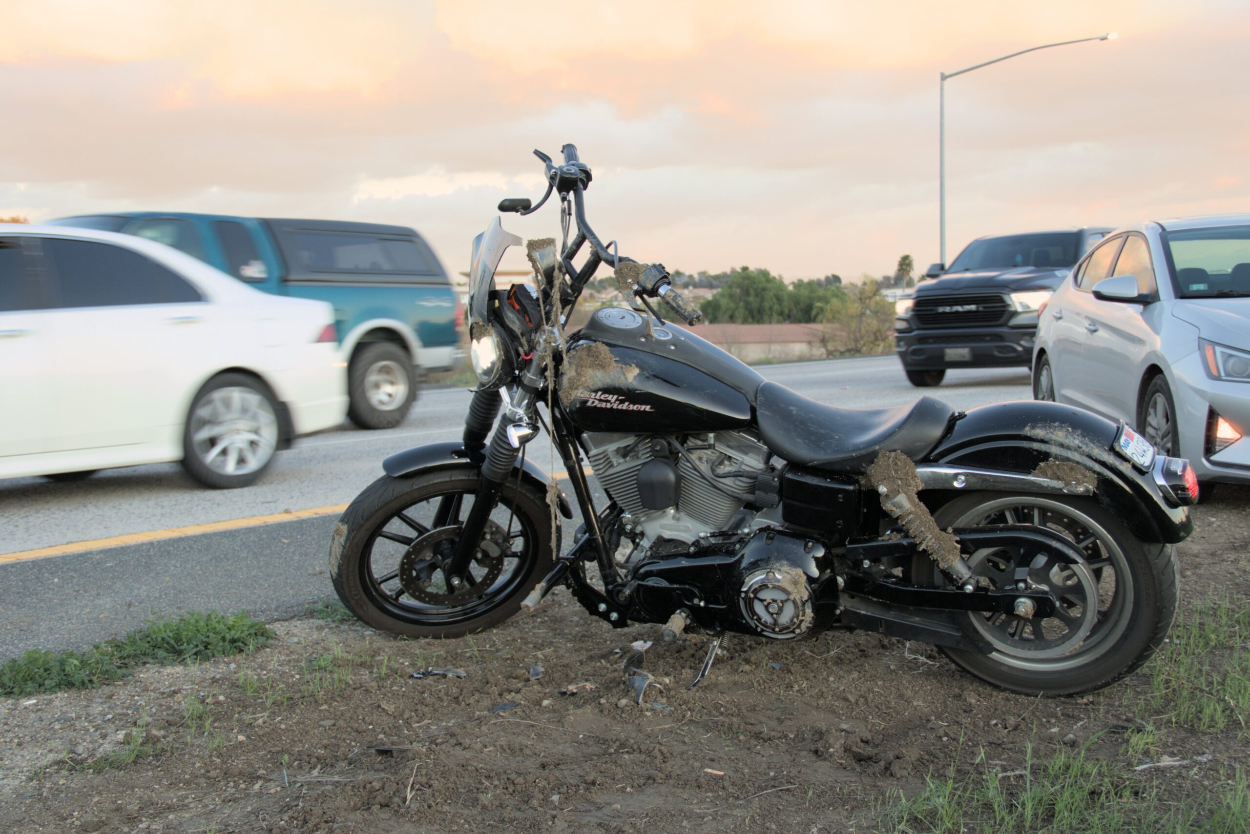 According to California Highway Patrol (CHP) radio traffic, reports indicated the motorcyclist was lane splitting prior to the collision. The rider went down in the center divider, where the white sedan also pulled over.