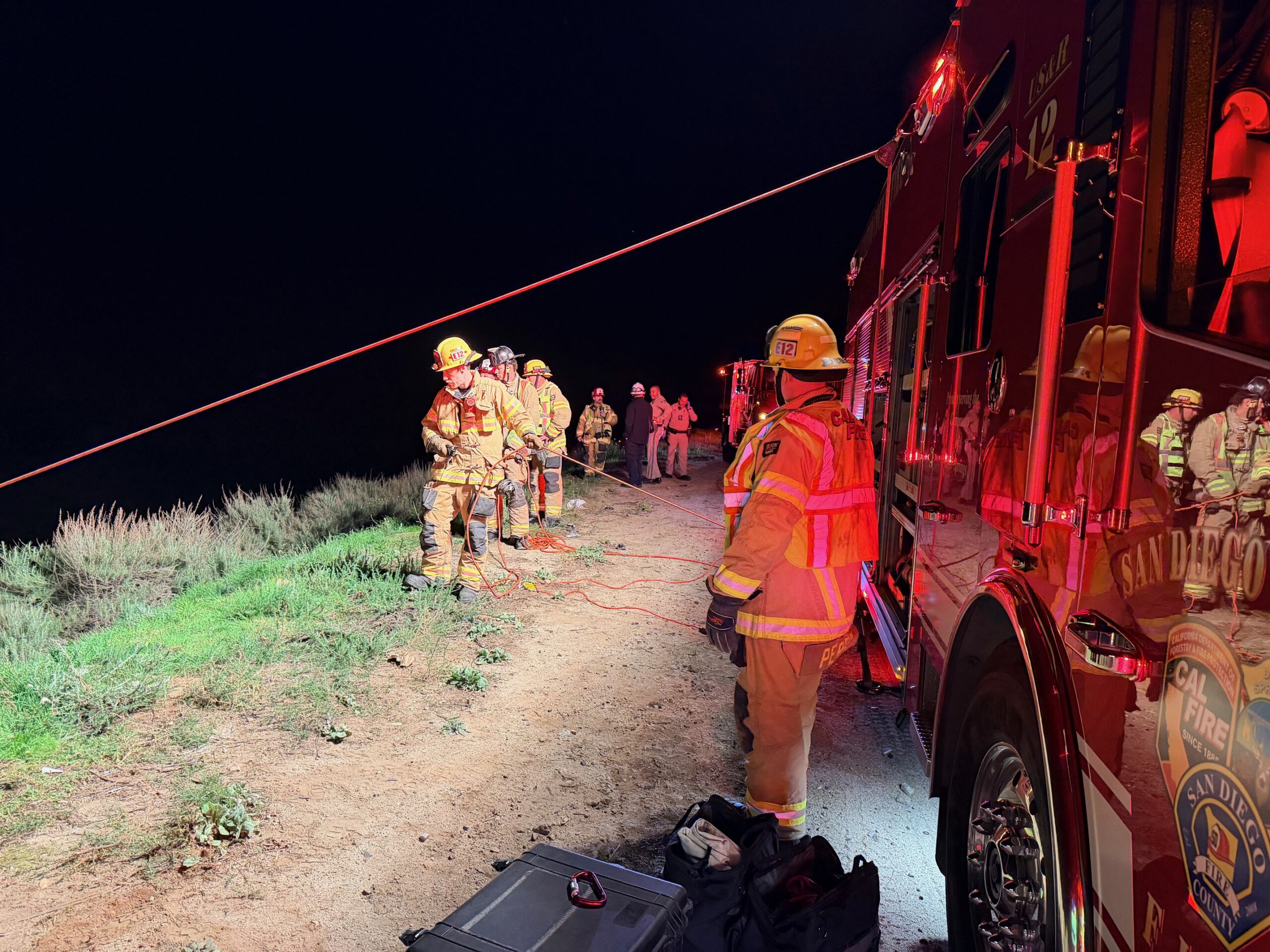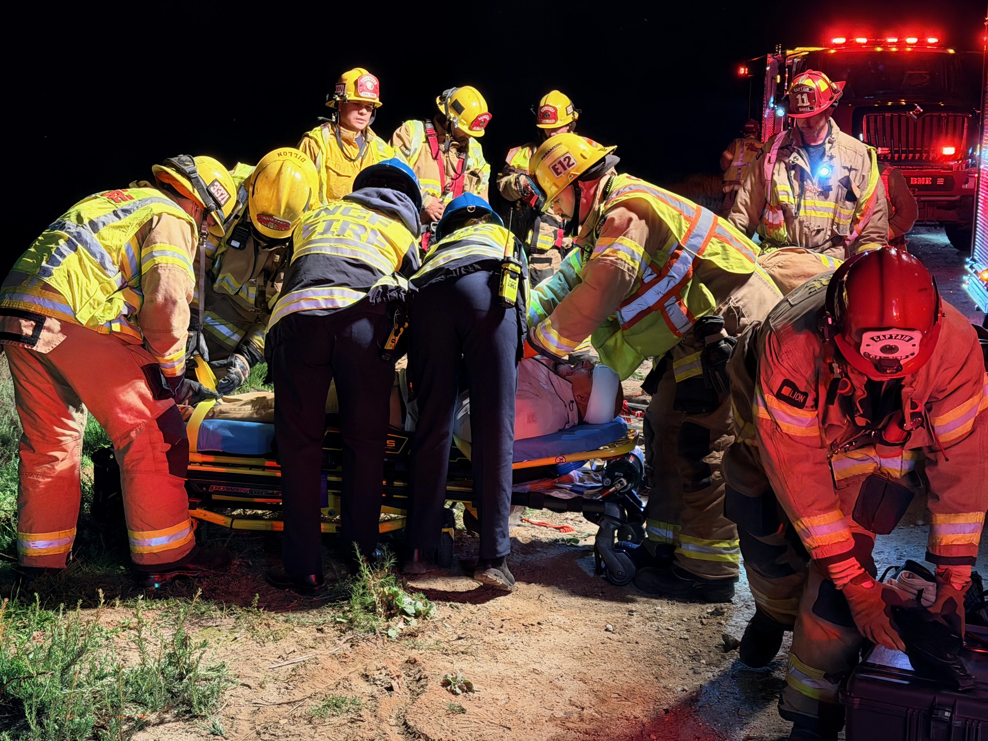 The vehicle traveled approximately 150 to 200 feet down an embankment and came to rest in a ravine. The driver was trapped and had to be rescued. The patient was extricated and hauled up the hill with a Stokes Basket and rope system, a process that took about 25 minutes, according to information provided at the scene. NCFPD Medic 114 transported the driver to Palomar Hospital, Code 3, according to Battalion Chief 3311 on scene. Witnesses told dispatchers the driver attempted to get out of the vehicle and may have struck his head during the crash.