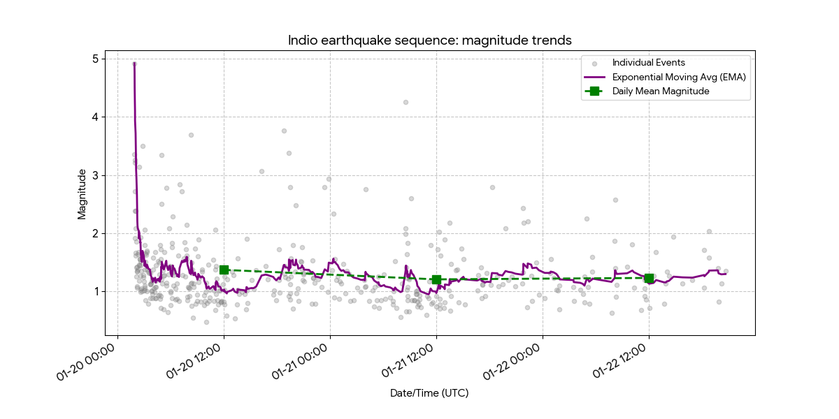 While the frequency of significant shaking has decreased since a sharp magnitude 4.3 jolt early Wednesday, the U.S. Geological Survey (USGS) data shows a steady progression of micro-quakes in the area. The most recent tremors, recorded Thursday, have been small, mostly measuring below magnitude 2.0.