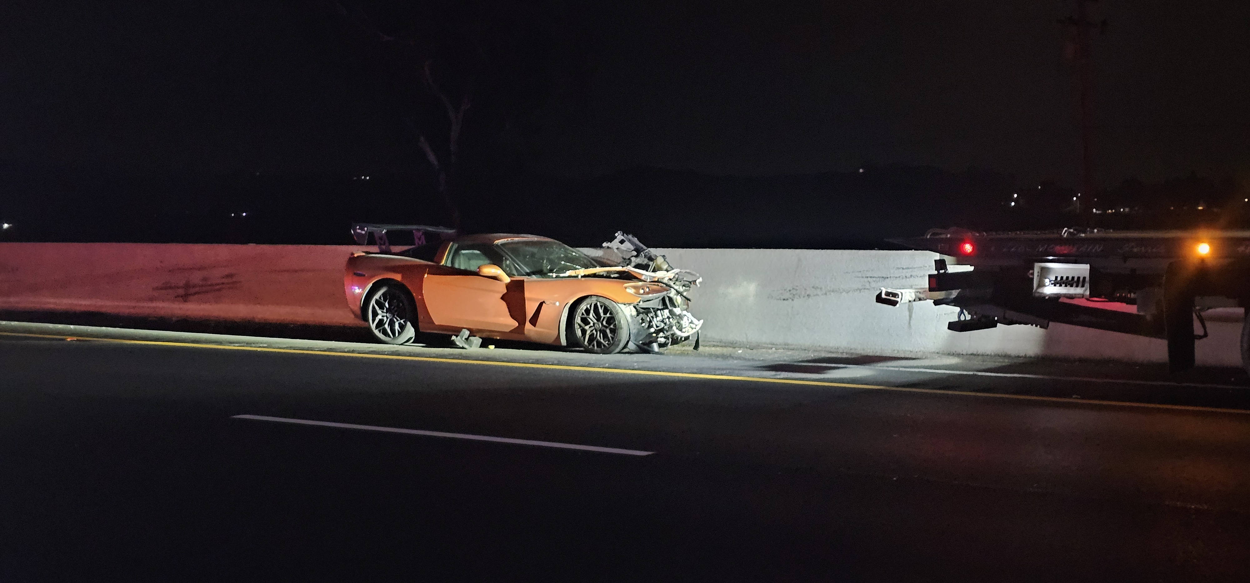 A bright orange Chevrolet Corvette with significant front-end damage.