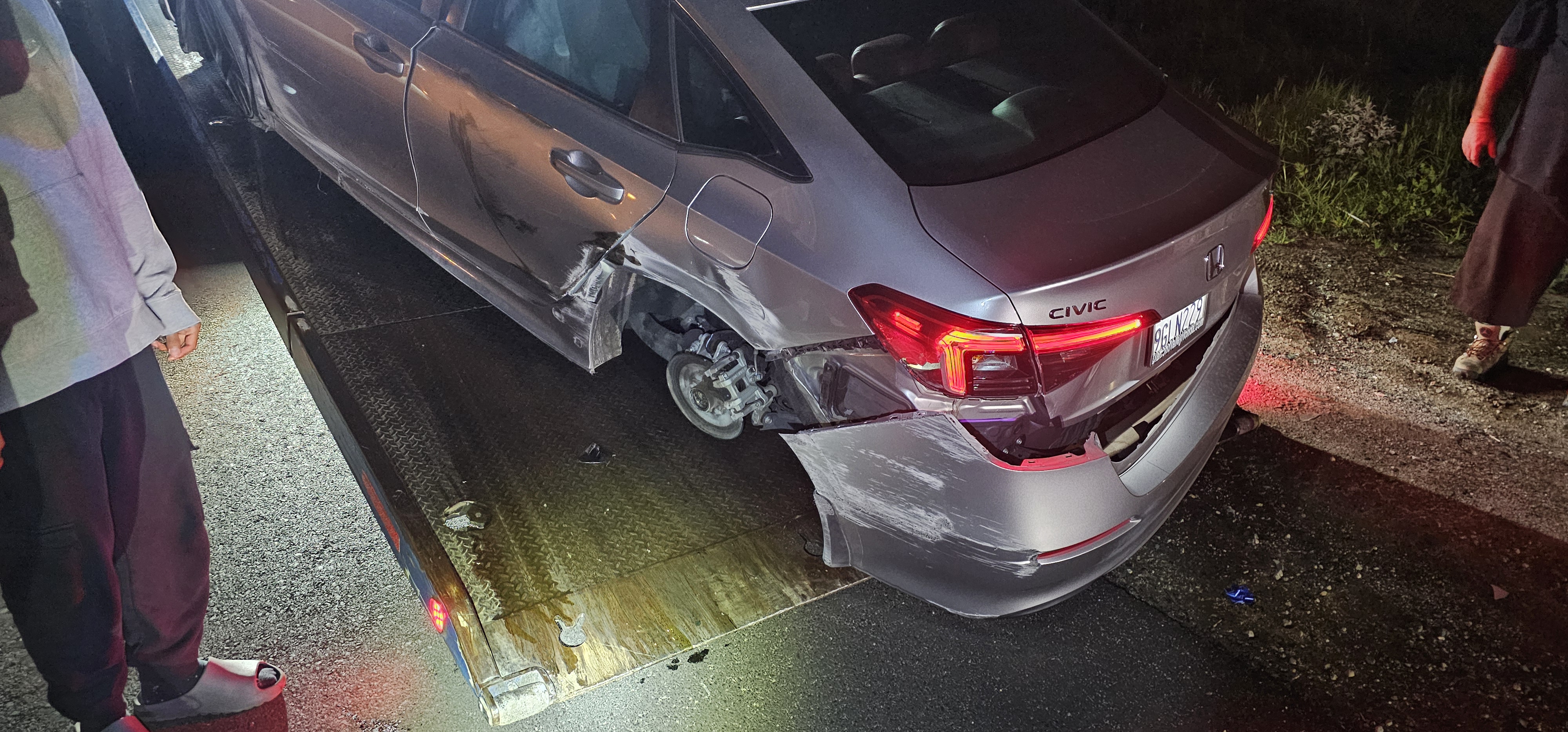 A silver Honda Civic being loaded onto a flatbed tow truck with major damage to the rear passenger-side wheel assembly.