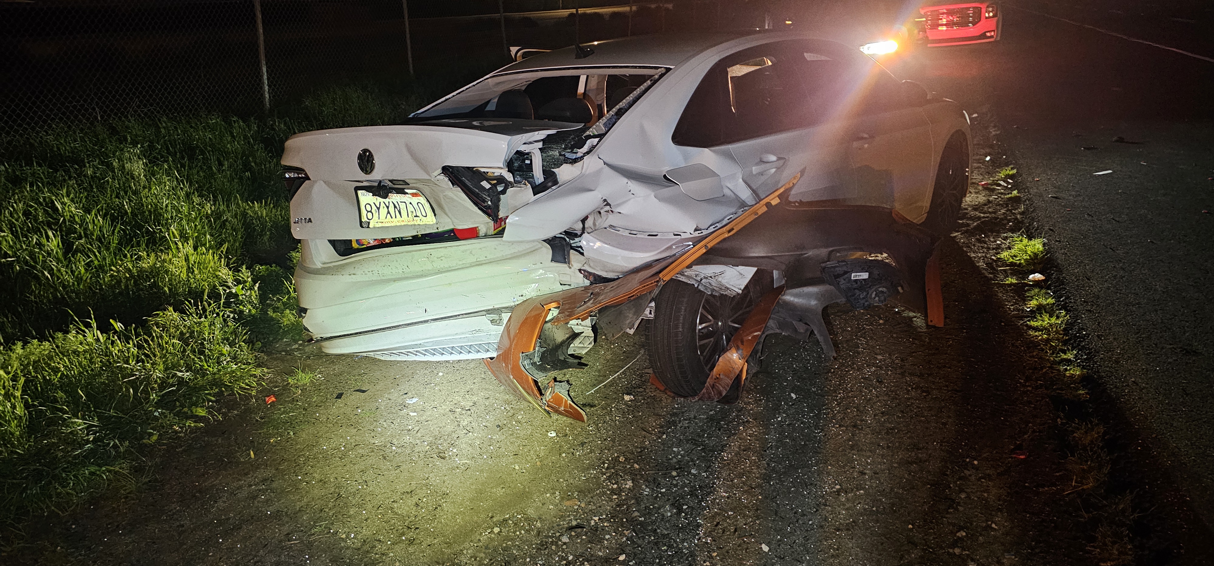 A white Volkswagen Jetta with a shattered windshield and extensive rear-end damage.