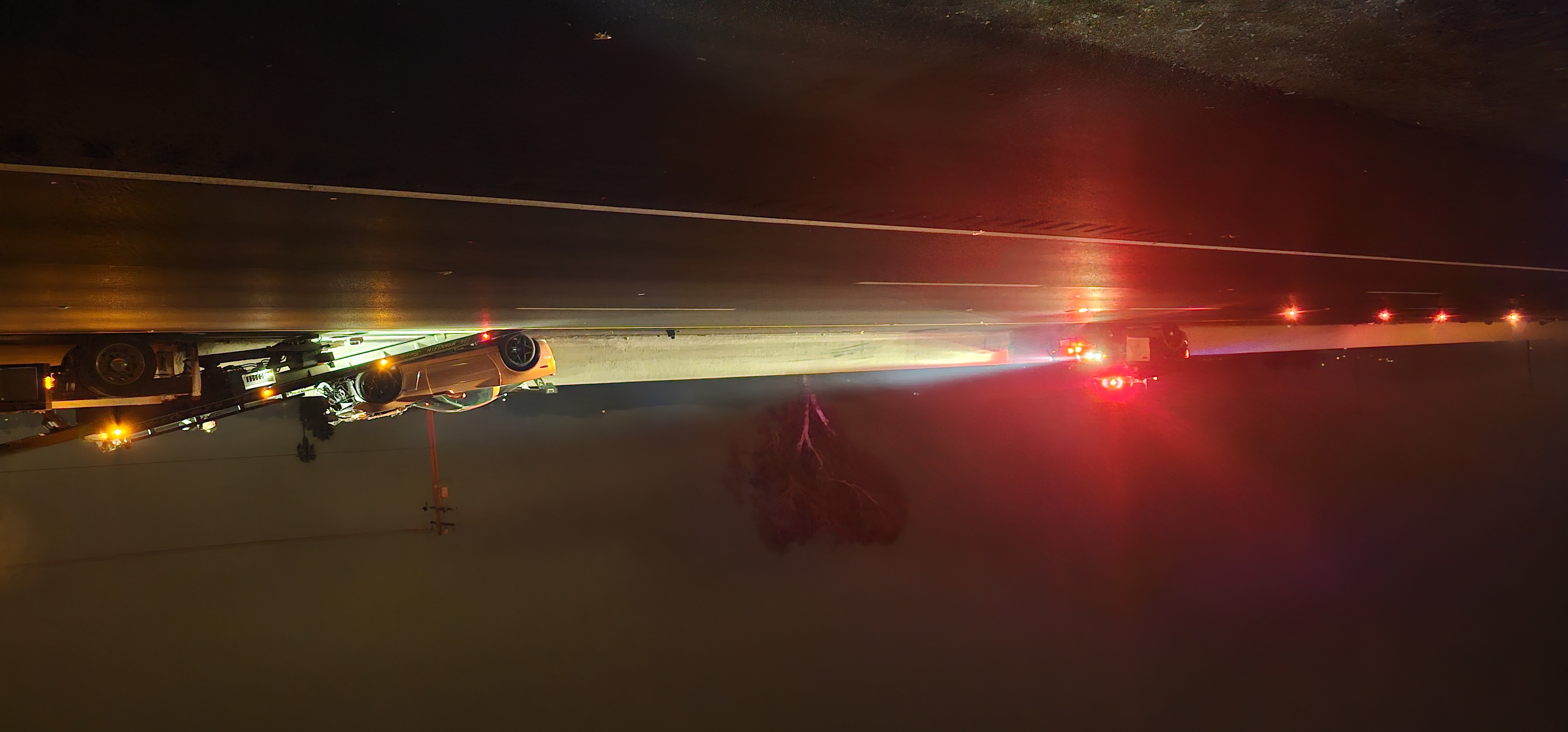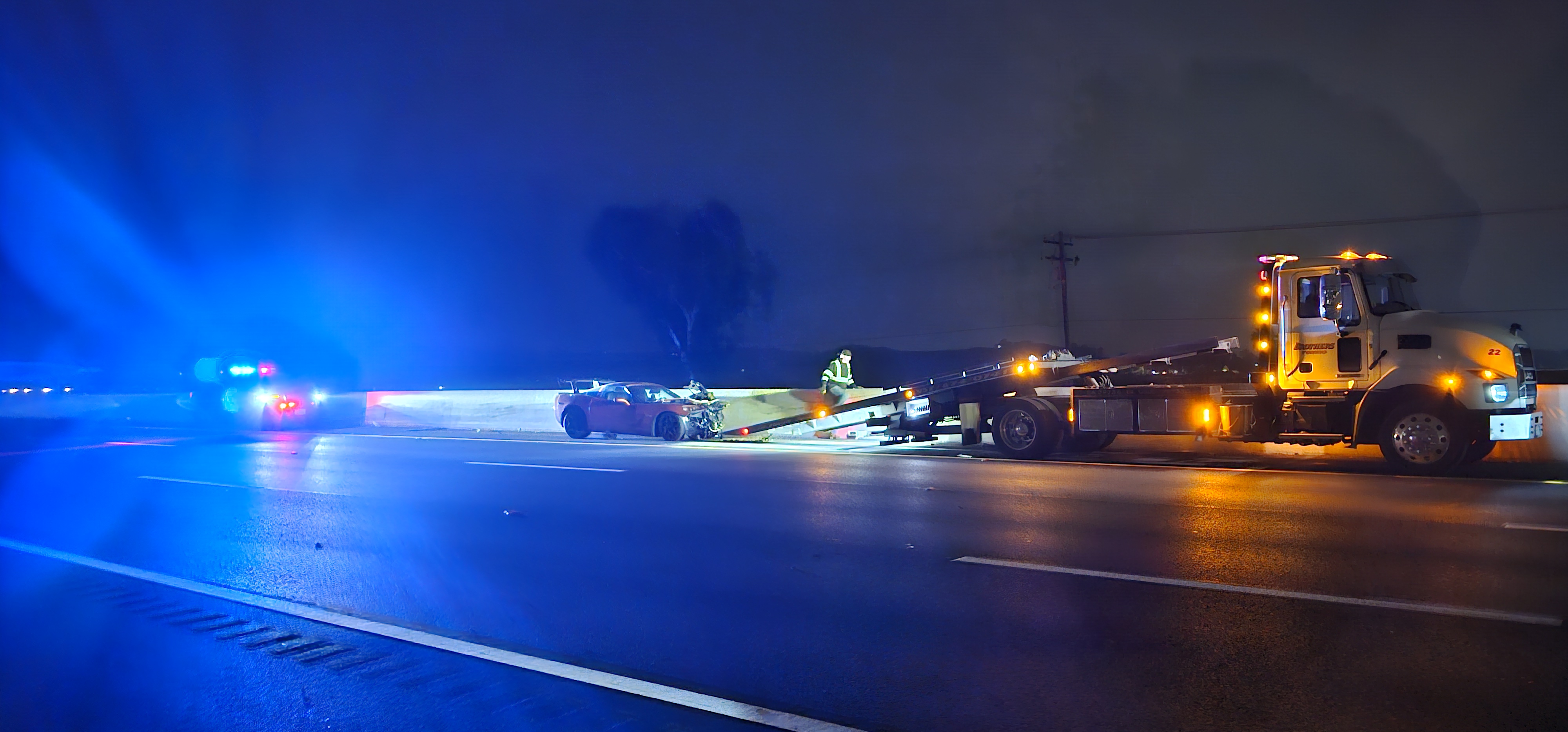 Debris was scattered across several lanes, including the southbound side of the freeway, which caused additional hazards for passing motorists. At approximately 1:15 a.m., officers on the scene requested a temporary stop of all northbound lanes to facilitate the removal of debris and the clearing of the roadway.
