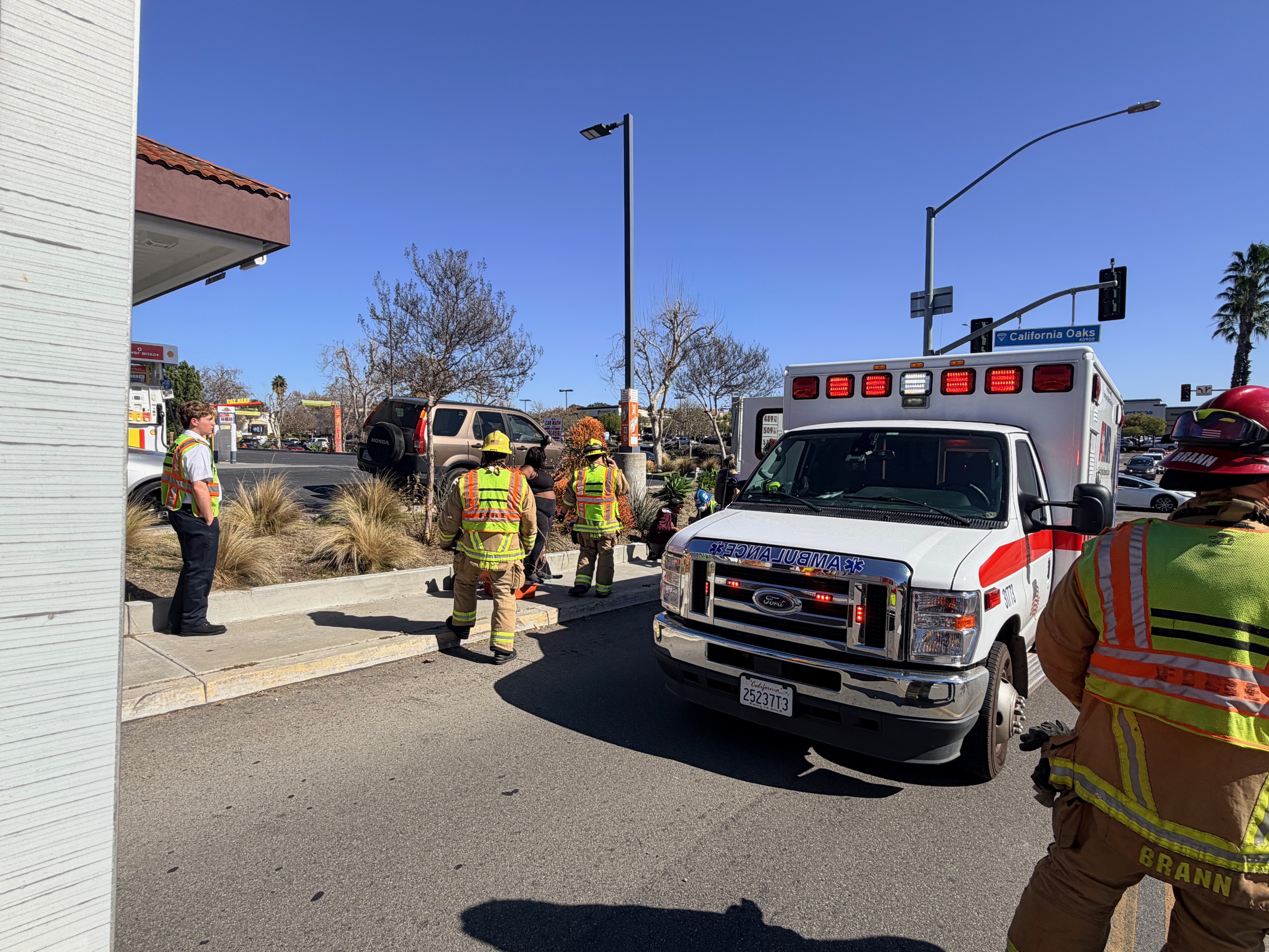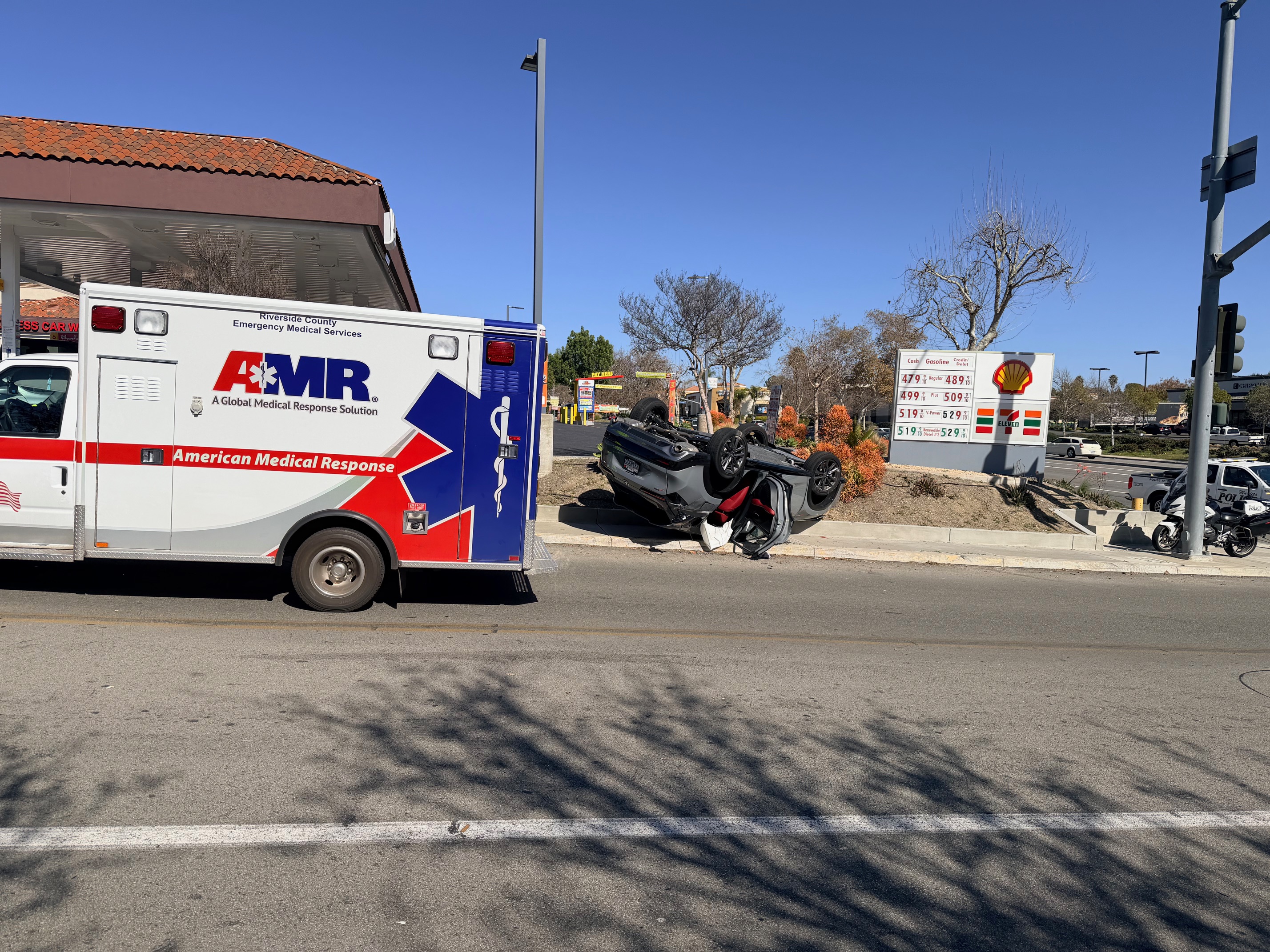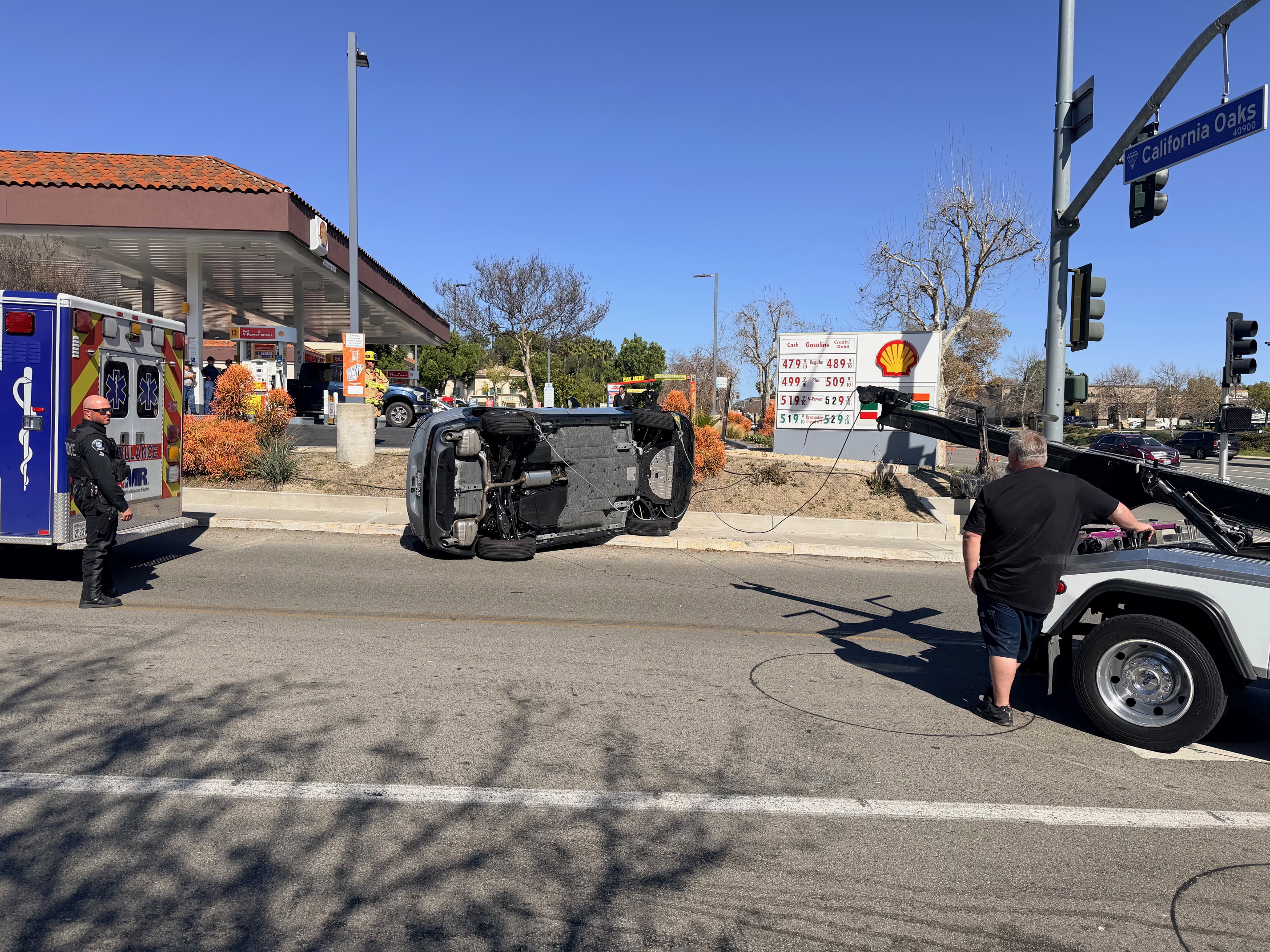 Emergency crews responded to a rollover traffic collision late Tuesday morning along California Oaks Road, where a vehicle came to rest on its roof near a gas station.