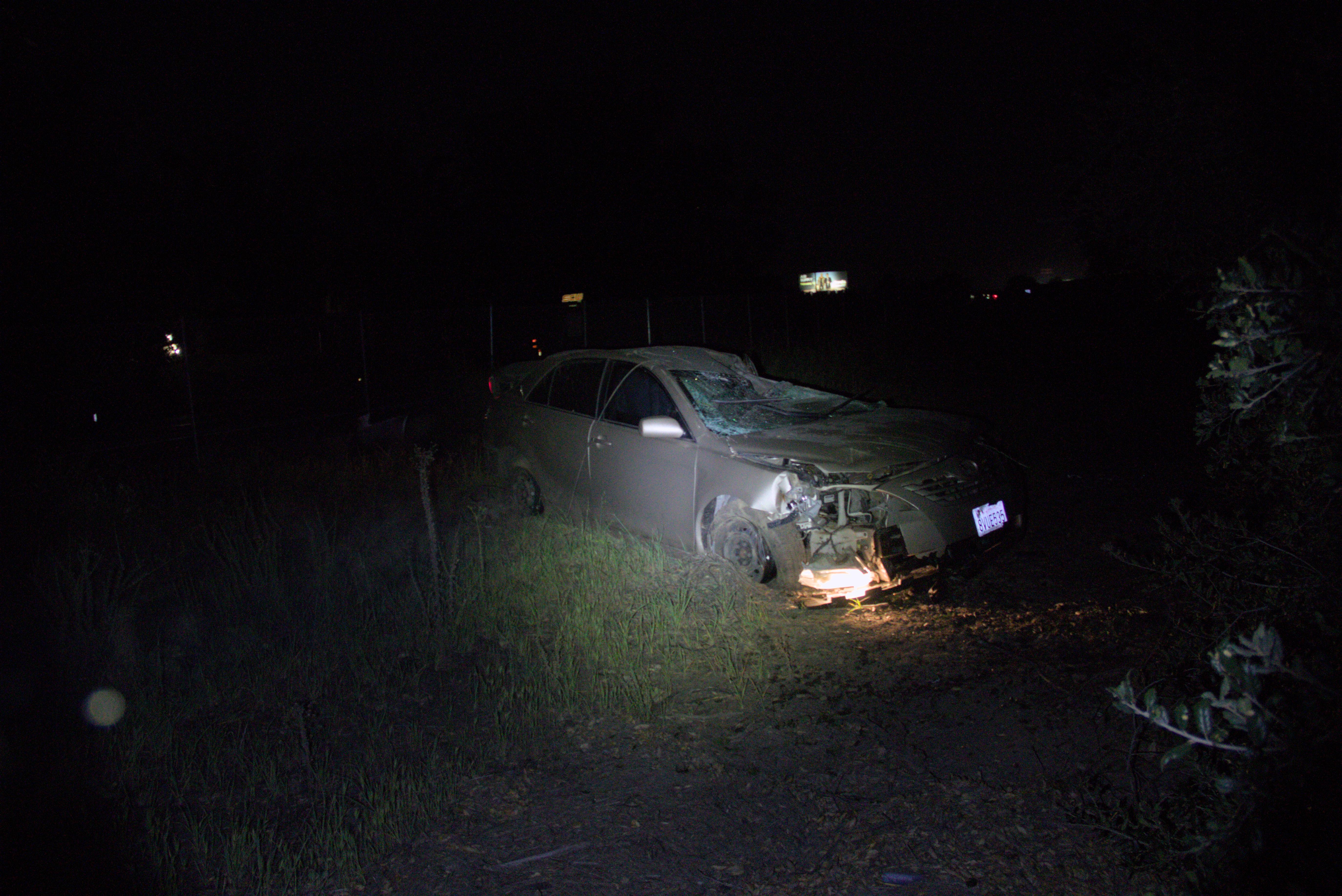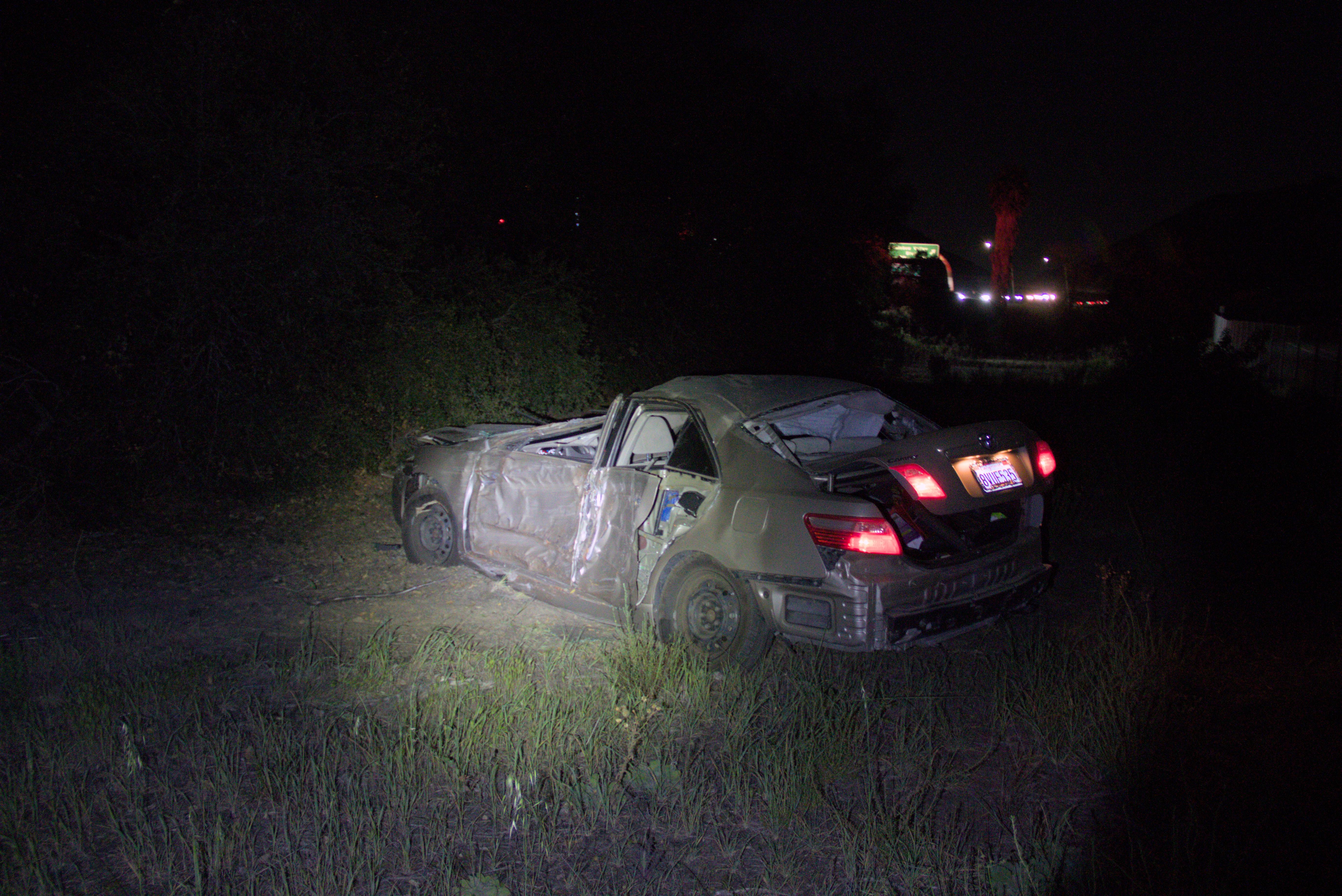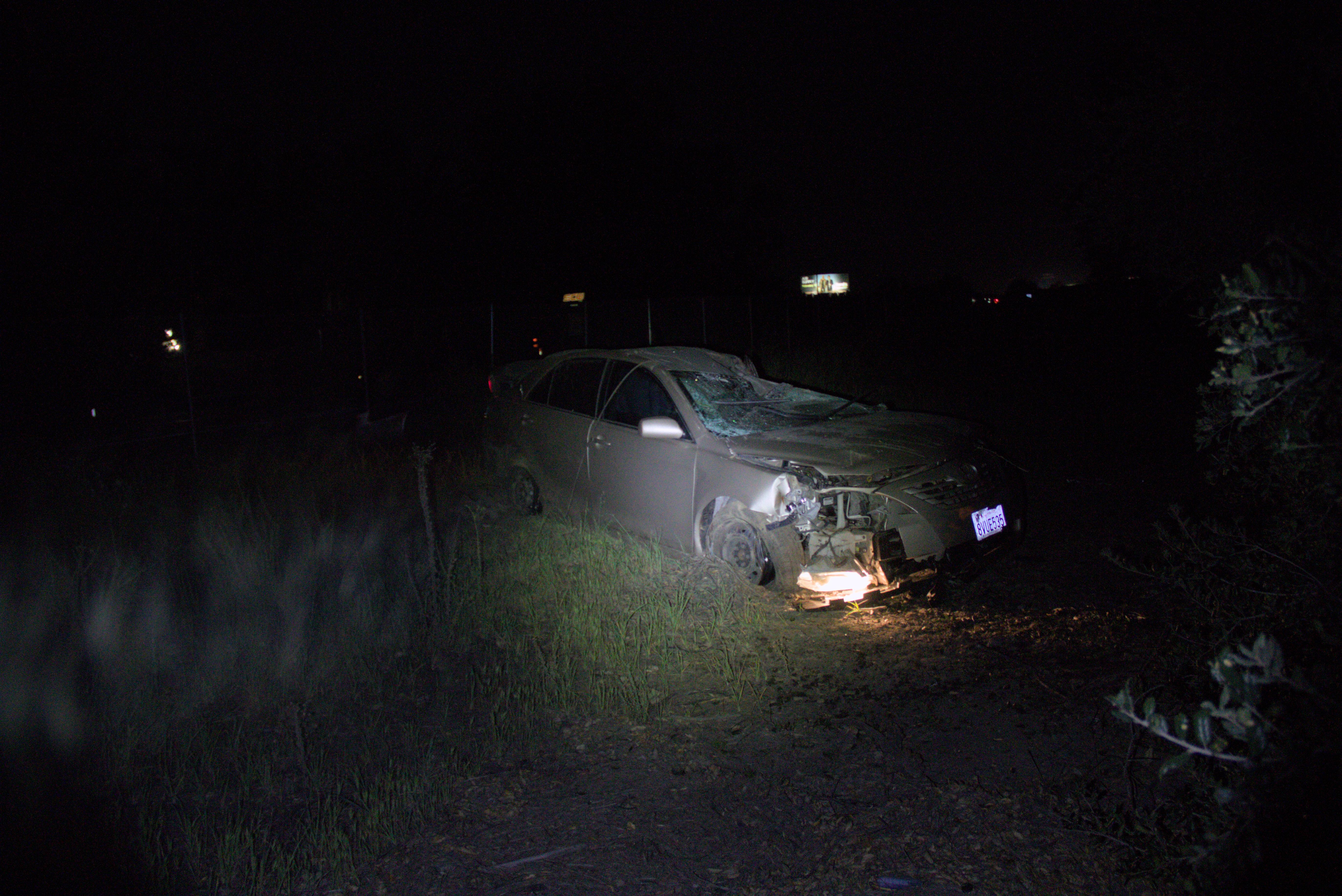 The incident was reported at approximately 9:56 p.m. on northbound I-15, south of Rainbow Valley Boulevard. According to California Highway Patrol (CHP) logs, a gray sedan reportedly crossed from the left lane to the right shoulder before striking a tree and descending the steep terrain.