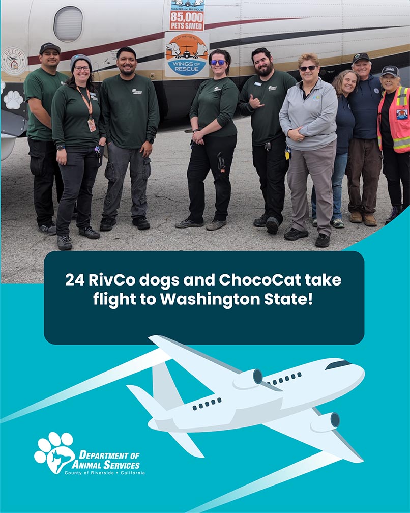 RIVERSIDE –The Riverside County Department of Animal Services partnered with Wings of Rescue to send 24 dogs and one cat on a flight to Washington state yesterday. The dogs arrived at Seattle Humane, and the cat named “Chococat” went to Seattle City Animal Shelter.With over 1,000 dogs across the shelter system, RCDAS continues to operate in critical overcapacity for the number of dogs compared to kennel space, and hit 230% capacity for dogs in February.“Our monthly flights with Seattle Humane make a major impact by c