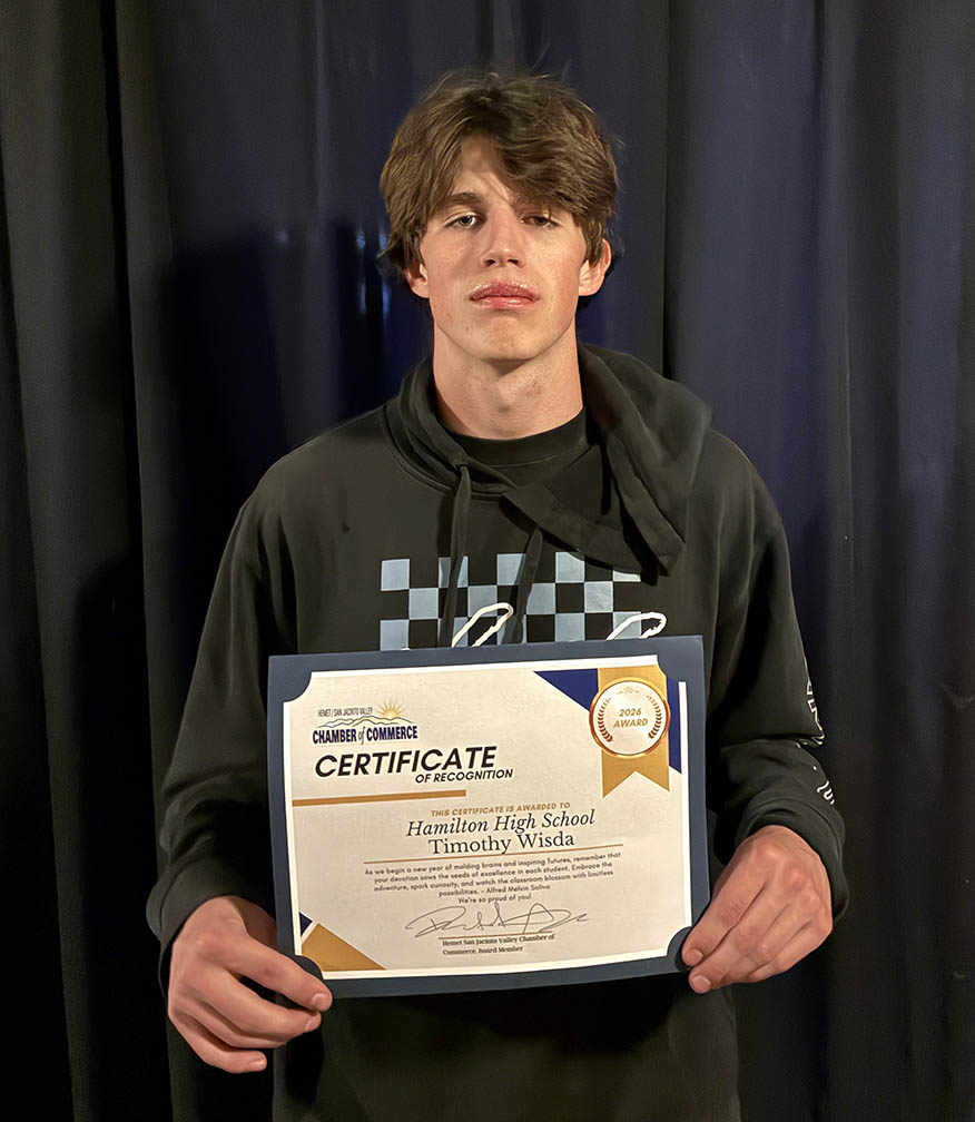 Hamilton High School Principal Kari Sanchez said that due to unforeseen circumstances, Timothy was unable to attend the ceremony. Additionally, his nominating teacher was under the weather and could not be there. Rather than cancel, Sanchez reminded herself of the purpose of the event being about perseverance and getting through unexpected circumstances that are beyond our control. So she came from Anza to offer her congratulations to all the students being honored and to share a little bit about Timothy. “He has been through quite a bit,” she said. “He made some poor choices early on in his high school career but turned that all around. He’s now a three-sport athlete; an active member on our football, wrestling and baseball teams. He’s currently earning all As and Bs, and he is just the most respectful young man.” At a later date Sanchez was able to meet with Timothy and present him with his backpack and Student of the Month trophy. She said he expressed much gratitude and was apologetic that he could not attend the breakfast. “Motivation gets me started, but daily consistency is what has made the difference for me,” Timothy said.