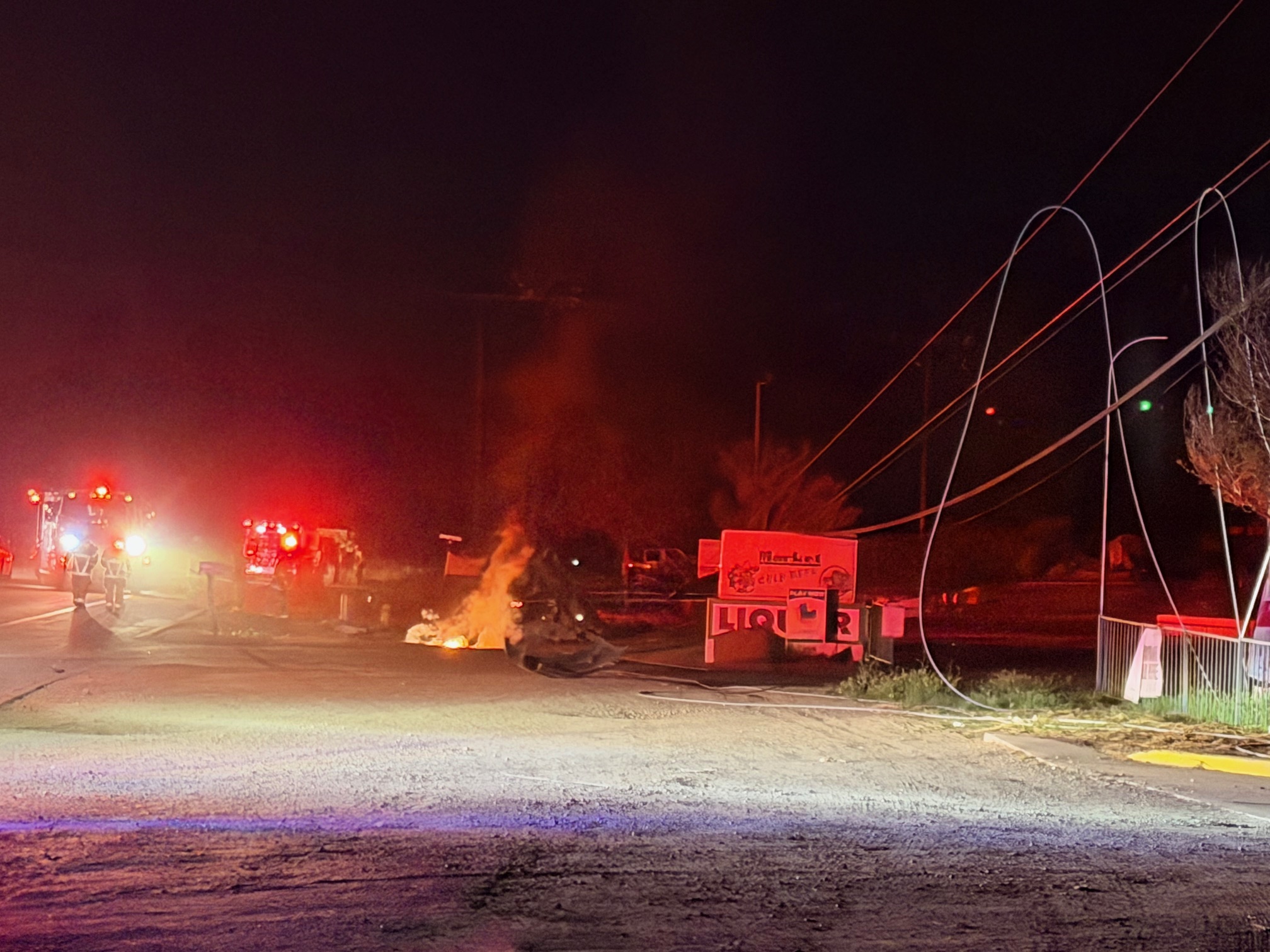 The incident was first reported at 12:05 a.m. near 21576 Ethanac Rd. According to emergency dispatch logs, a dark blue or black sedan crashed into an electrical transfusion box and a cable pole. The impact caused the poles to fall into the traffic lanes and immediately ignited a fire, with sparks visible in the area.