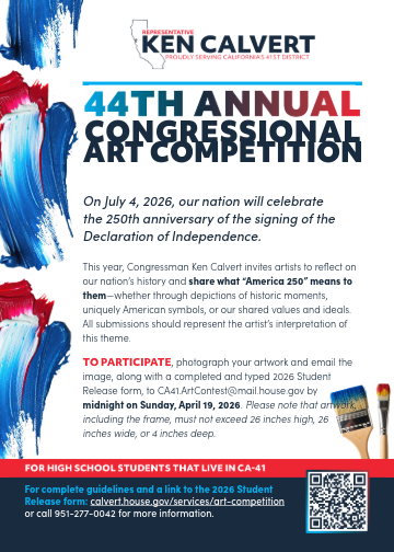 The United States will celebrate the 250th anniversary of the signing of the Declaration of Independence. Congressman Ken Calvert (CA-41) invites high school artists to participate in the 44th Annual Congressional Art Competition.