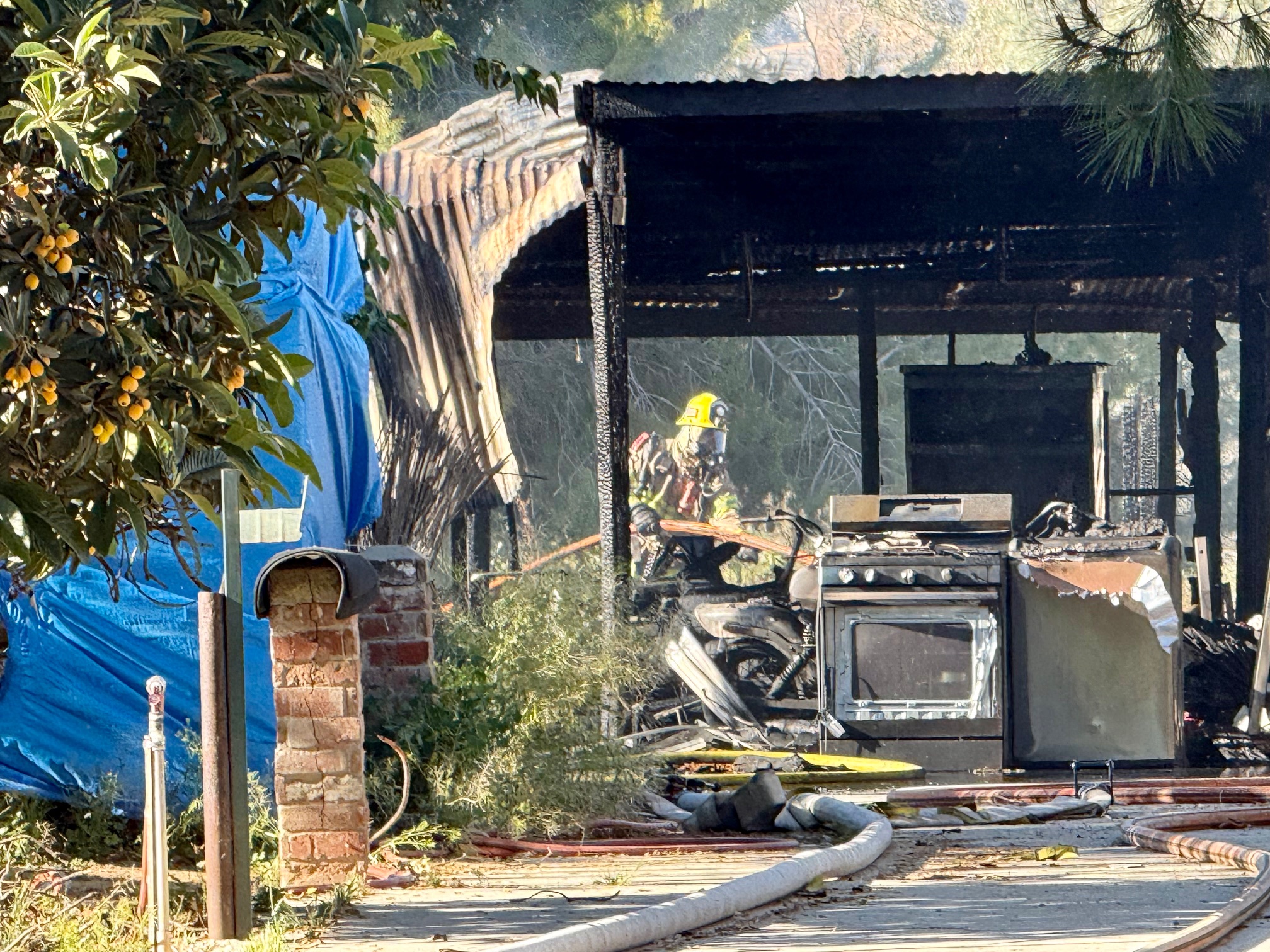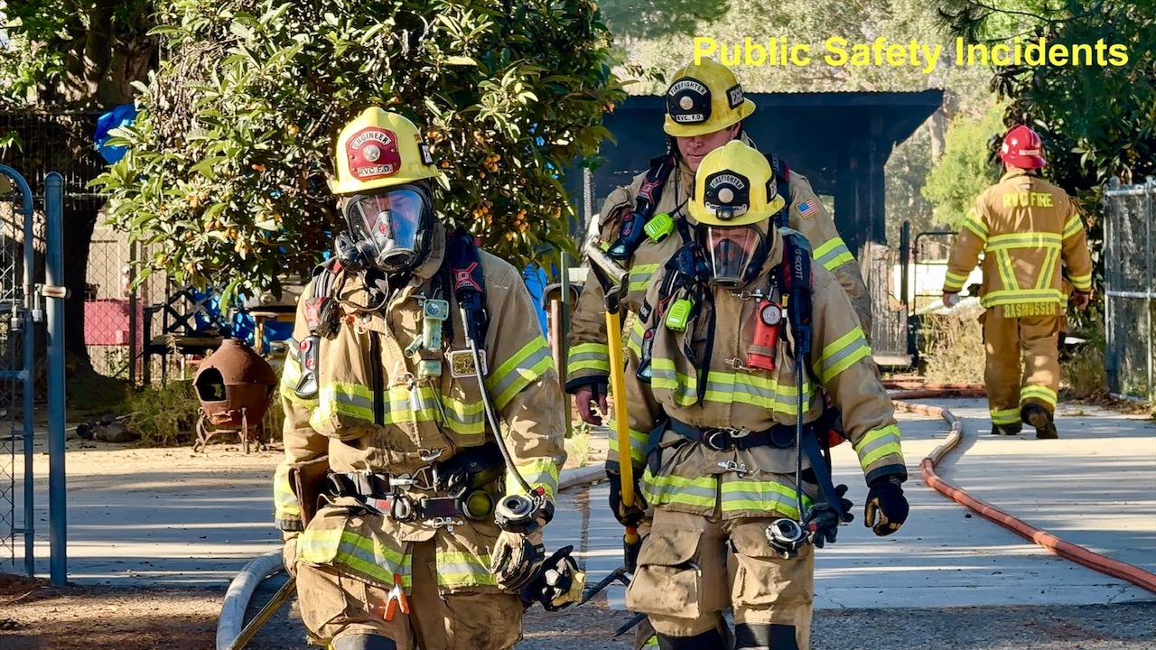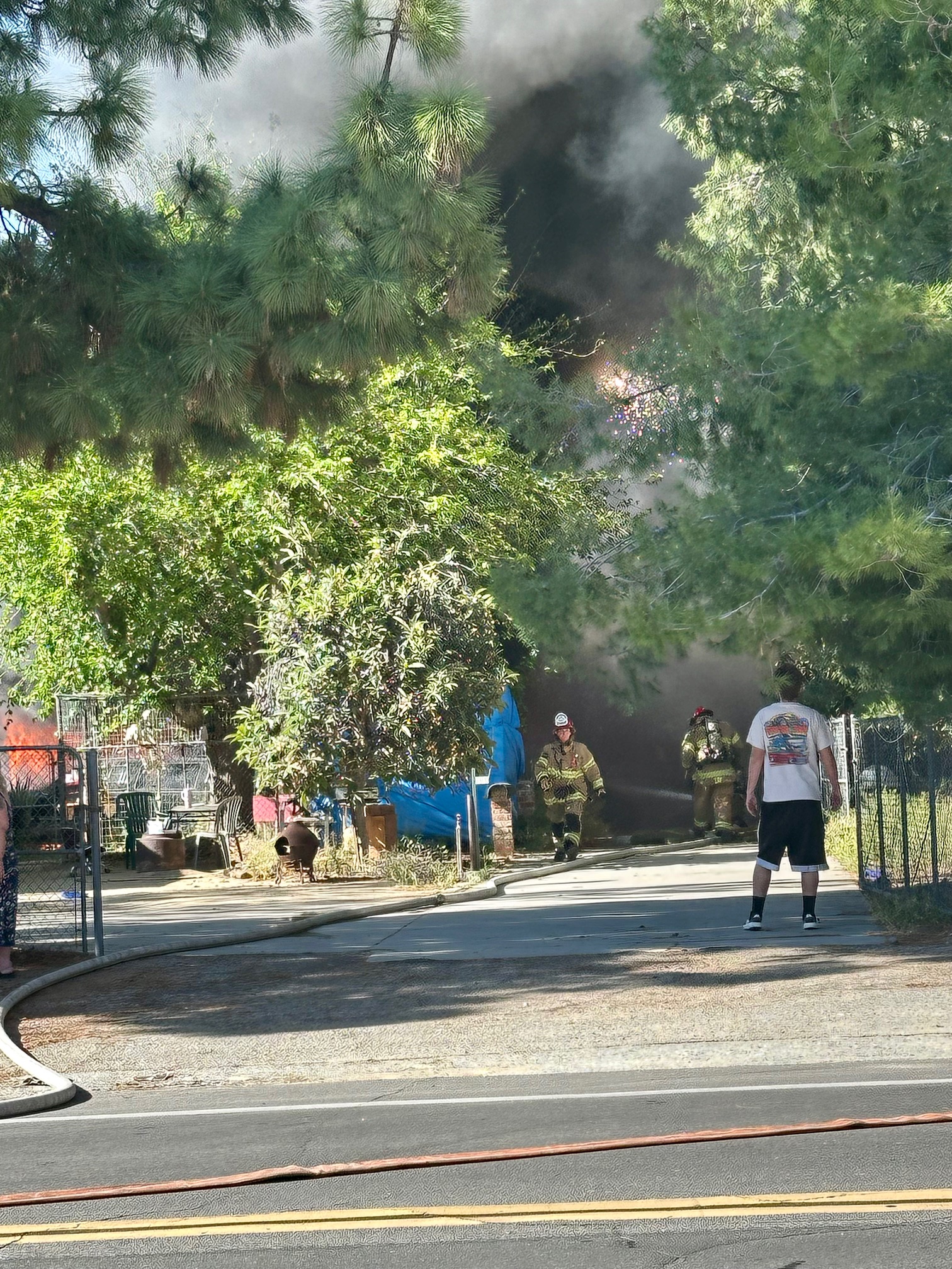Cal Fire was dispatched at 4:10 p.m. to the 43300 block of Hemet for a reported residential structure fire. The incident commander confirmed a working fire at the rear of the property, where a 50-by-50-foot outbuilding was fully involved and flames had spread into surrounding vegetation.